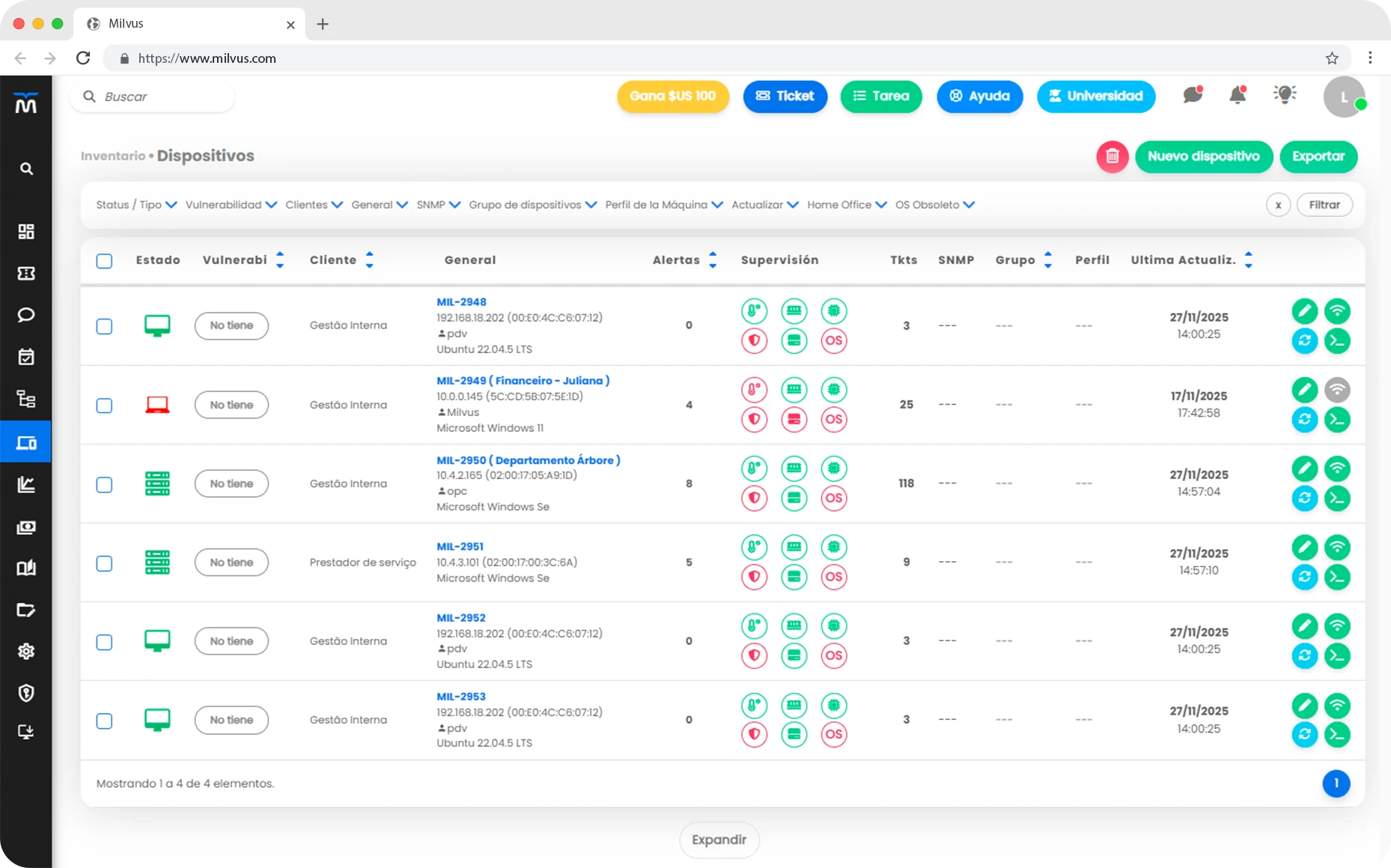 Centralice el inventario de hardware y software, obtenga visibilidad en tiempo real y controle costos, licencias y el ciclo de vida de todos sus activos de TI desde una sola plataforma.